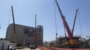 An 80 ton mobile crane lifts a section of the ore loading bin as part of ongoing structural installation activities